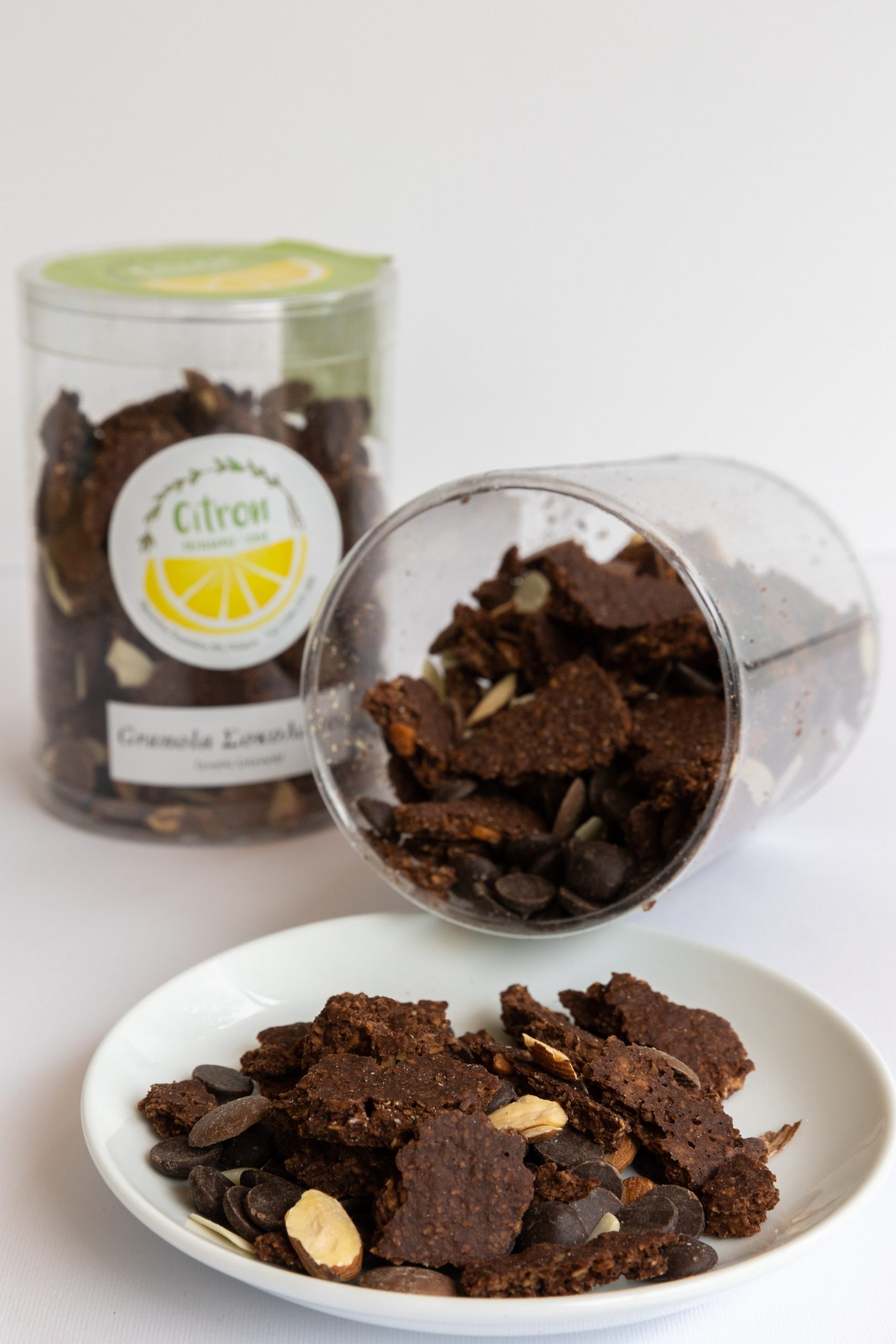 Η απόλυτη σοκολατένια granola , 100% vegan και plant based, τραγανή άκρως γευστική σαν σοκολατίνα. Πρόκειται για ένα βάζο ευτυχίας που μόλις φτάσει στα χέρια σας θα θελήσετε να το κάνετε μια χαψιά. Είναι πλούσια σε αντιοξειδωτικά  καθώς φτιάχνετε με νιφάδες βρώμης, σιρόπι σφενδάμου και εκχύλισμα αγαύης ως γλυκαντικά υποκατάστατα, ακατέργαστο βιολογικό κακάο, κομμάτια από καβουρδισμένο φουντούκι, chia seeds, λιναρόσπορο αλεσμένο, κολοκυθόσπορο , ηλιόσπορο, εκχύλισμα φυσικής βανίλιας και βιολογικό λάδι καρύδας. Σιγοψήνετε μέχρι να αποκτήσει καραμελένιο χρώμα και εμπλουτίζετε με κομμάτια από δύο είδη σοκολάτας bitter και γάλακτος χωρίς προσθήκη ζάχαρης.